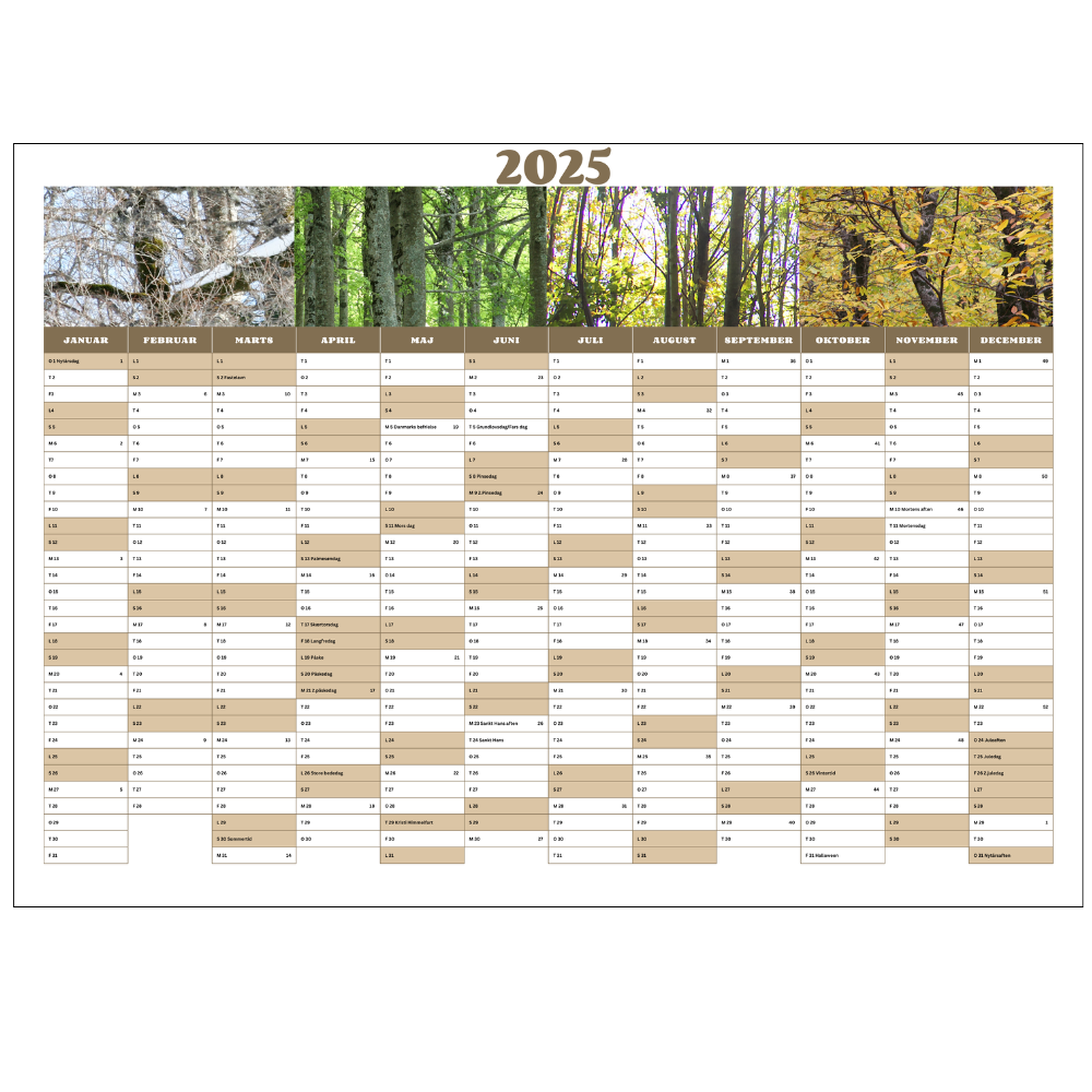 Hold styr på hele året med denne elegante vægkalender for 2025. Designet de fire årstider er holdt i naturens farver og farven er vores populære tosca