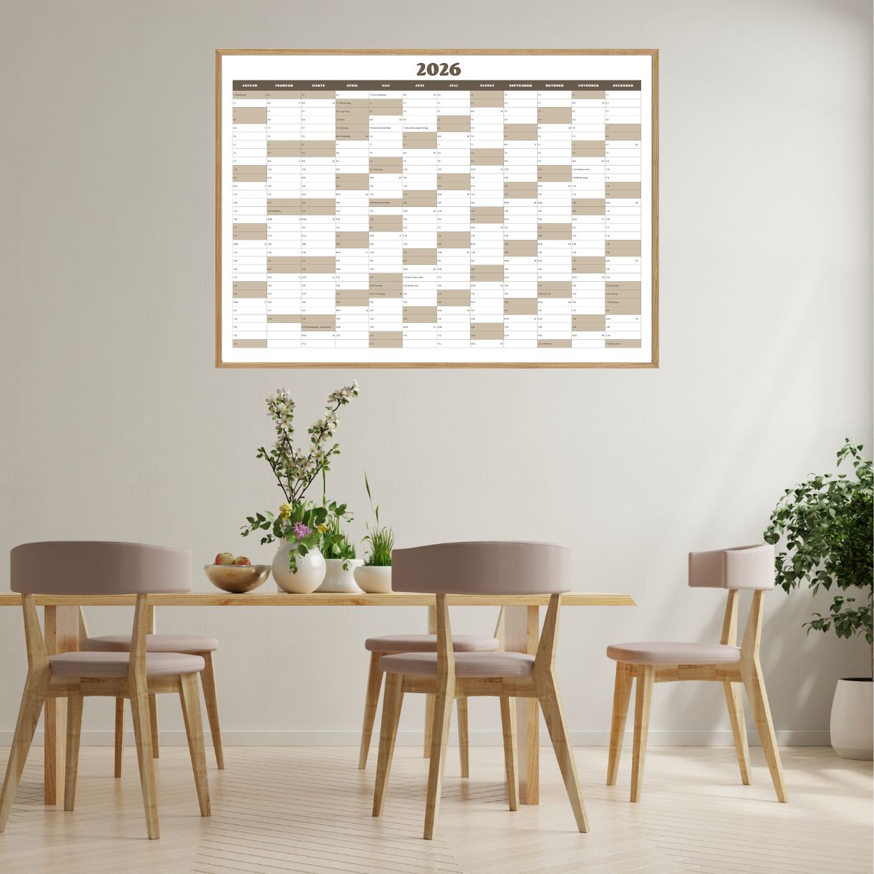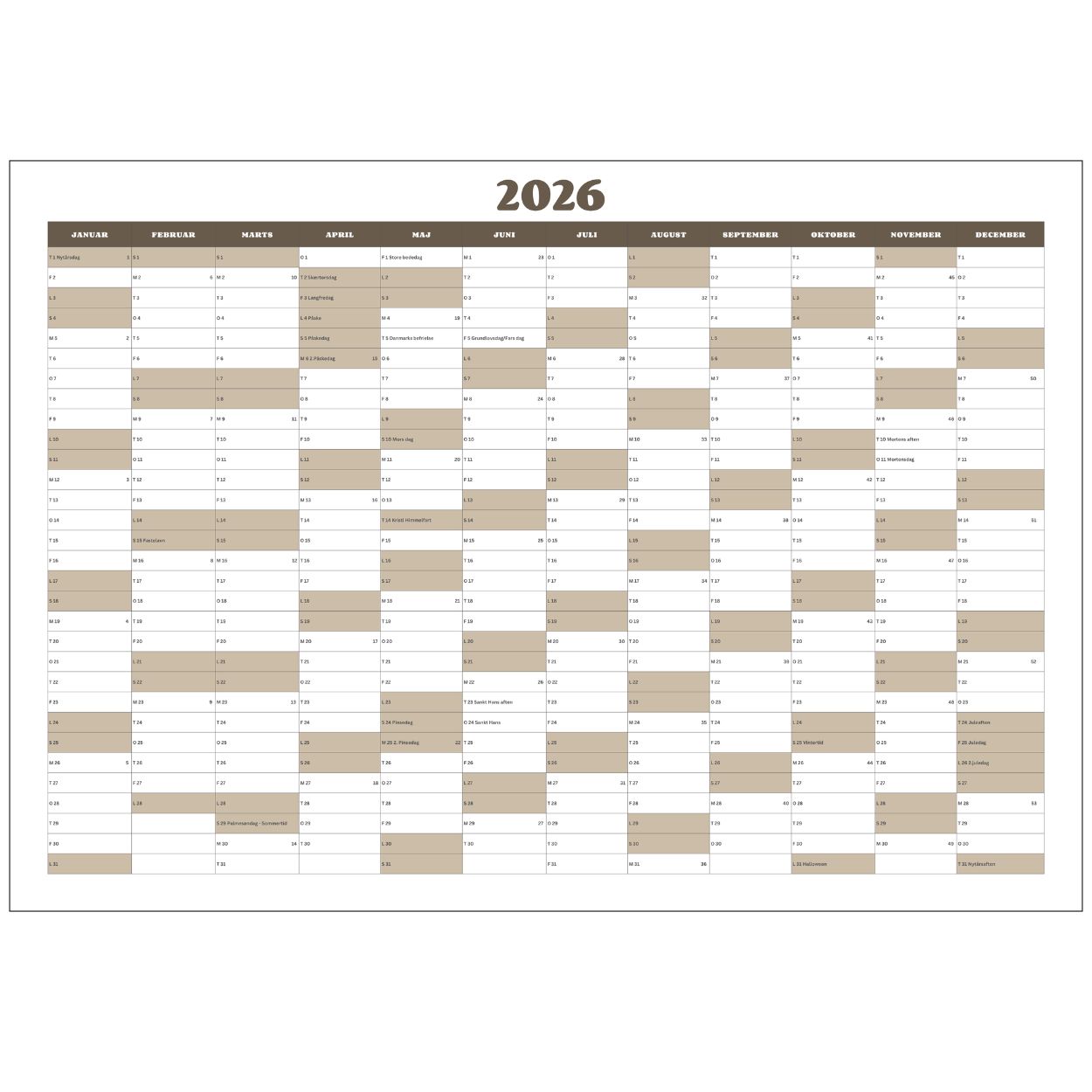 Hold styr på året 2026 med denne vægkalender 2026 i helt simpelt design i beige. Kalenderen viser alle 12 måneder på én overskuelig side og er designet i stilfuldt design, der skaber glæde i både kontoret, køkkenet eller entréen.