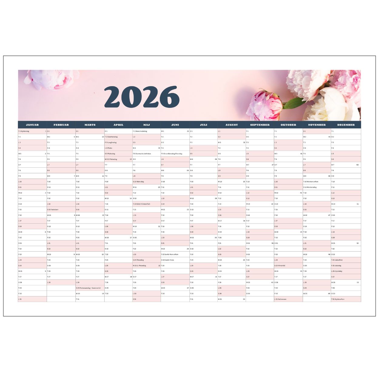 Hold styr på året 2026 med denne dekorative og praktiske vægkalender 2026 med denne dekorative og praktiske kalender med pæoner og rosa farvetema. Kalenderen viser alle 12 måneder på én overskuelig side og er designet i stilfuldt design, der skaber glæde i både kontoret, køkken eller entré.