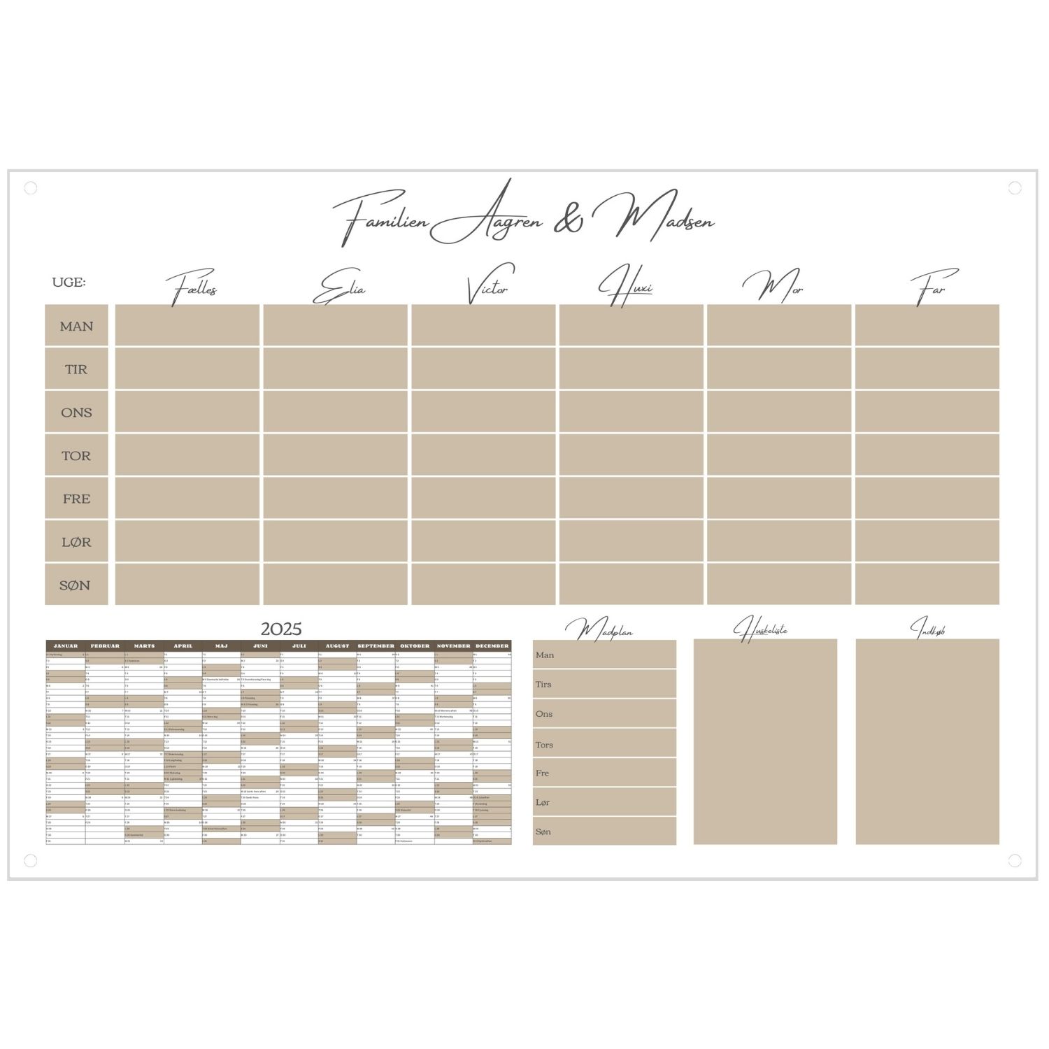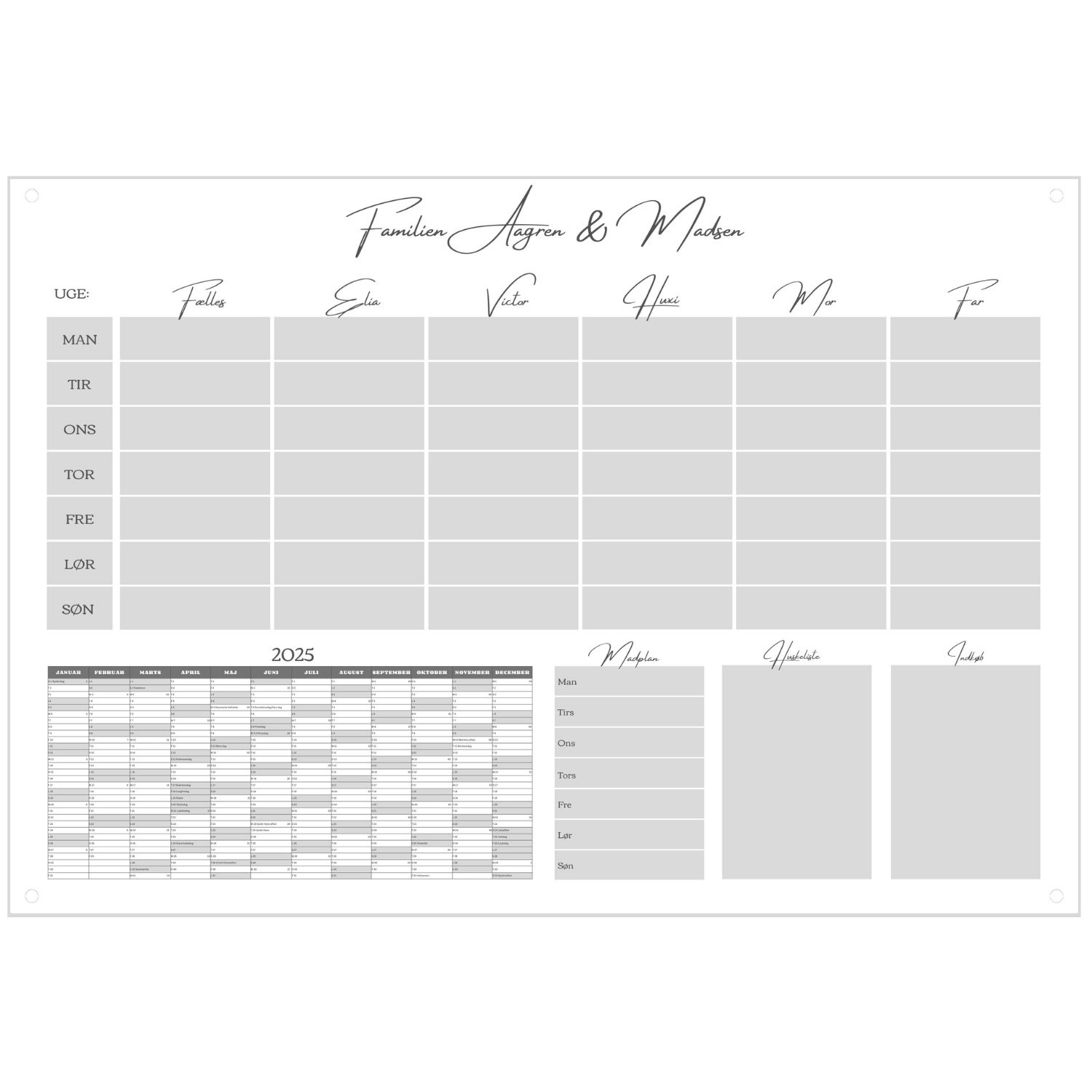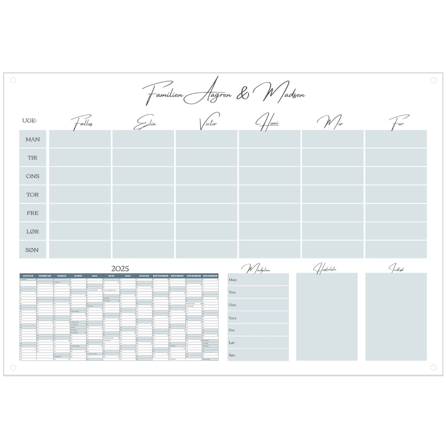 Fleksibel tilpasning: Skulle familien vokse, eller børnene flytte hjemmefra, kan navnene ændres, så kalenderen altid passer til jer.